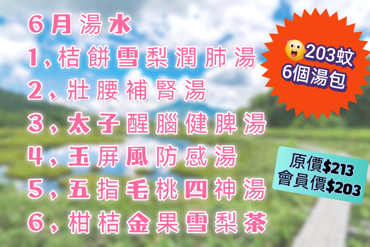 6月湯水 1,桔餅雪梨润肺湯 2,壯腰補腎湯 3,太子醒腦健脾湯 4,玉屏風防感湯 5,五指毛桃四神湯 6,柑桔金果雪梨茶 原價$213,會員價$203